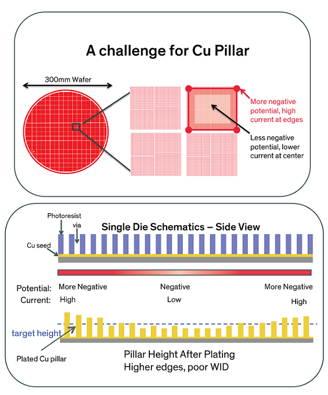 Pillar height needs to be consistent for proper die attach, but electrochemical potential is not uniform across each die on a wafer. It will be higher at the edges and corners, resulting in taller bumps at the edge and therefore insufficient contact at the center of the die, where the pillars are lower. The higher the bump density, the greater the challenge.