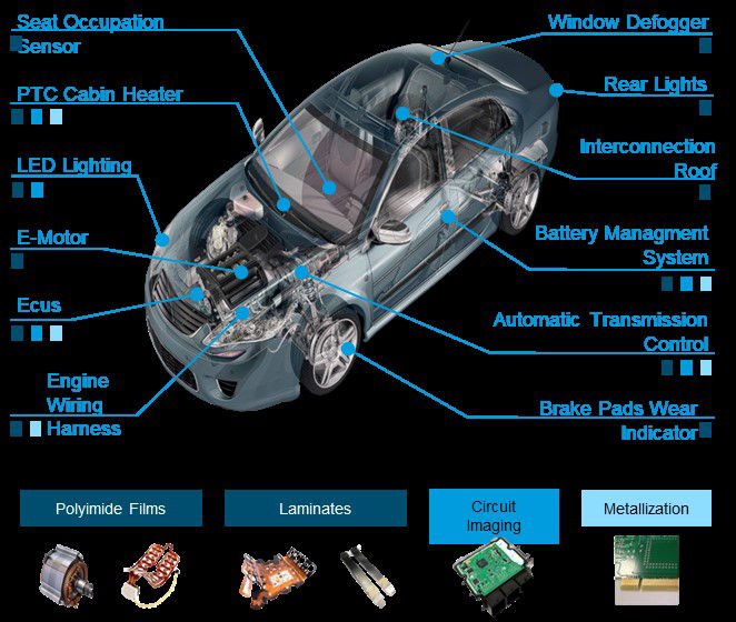 DuPont’s automotive solutions comprise not only our laminates for flex circuits, but also circuit imaging, metallization and a range of polyimide films, as Figure 2 illustrates. Together, they enable better thermal management, high speed and high frequency needed for sensors and radar in connected vehicles, integrated electronic control units, and high-reliability boards.
