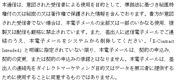 Cette communication est faite dans le but d'une utilisation par son destinataire et contient des informations qui peuvent être confidentielles ou protégées par des lois en vigueur. Si vous n'êtes pas le destinataire voulu, la présente communication vous notifie formellement qu'un usage, une copie ou une distribution de ce message électronique, dans son intégralité ou en partie, est strictement interdite. Nous vous remercions d'informer l'expéditeur dudit message par retour de courrier électronique, et d'effacer ce courrier électronique de votre système. Ce courrier électronique ne constitue ni une offre de contrat, ni un avenant à un contrat, ni une acceptation d'une offre contractuelle, sauf si l’expression « Aux fins de la conclusion d’ E-Contract » est expressément et visiblement mentionnée. Ce courrier électronique ne saurait en outre constituer un consentement à une utilisation des informations relatives à l'expéditeur pour des raisons de marketing direct ou de transfert de données à des tiers.